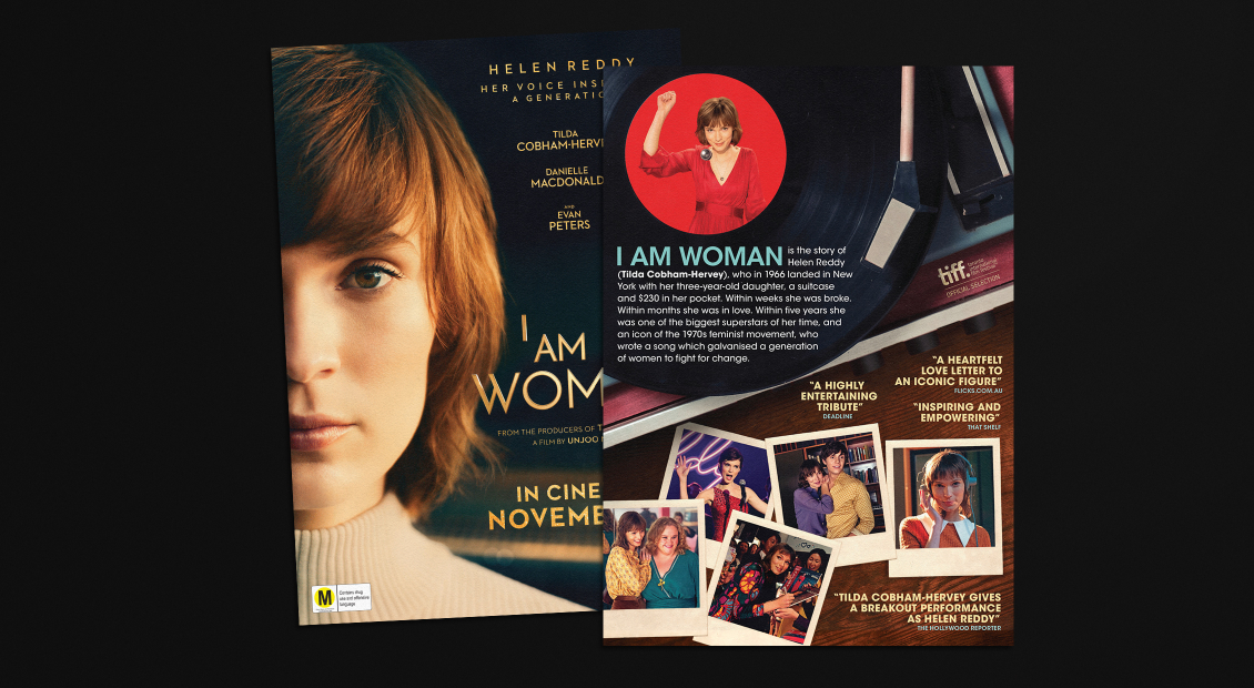 Prior to COVID-19, I Am Woman had been destined for a wide theatrical release in Australia. Working with Transmission Films, we began developing campaign collateral and promotional materials including a set of pin-on badges released for International Women’s Day 2020, as well as cinema flyers, standees and premiere media walls. The pandemic tragically paused the release and the film’s release was shifted to Stan. originals with a handful of special Q&A screenings in cinemas. The theatrical release for NZ, however, is slated for November 12, 2020.
