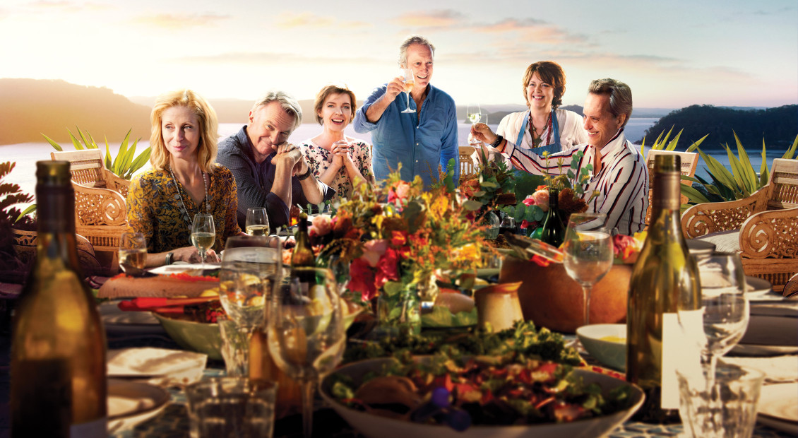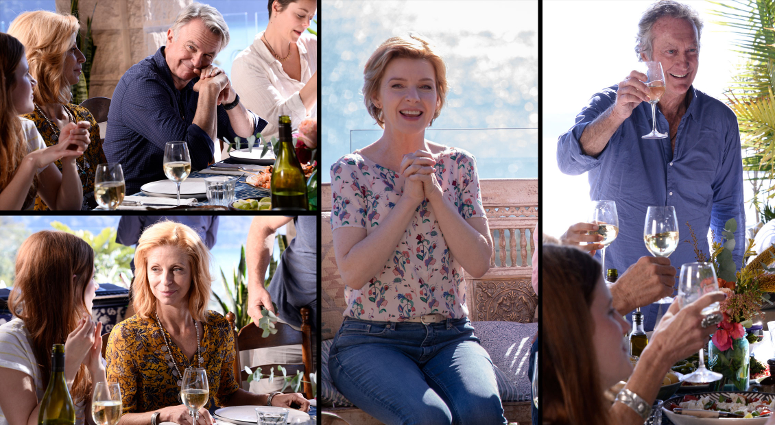 Unit photography was supplied and fixed, with no option to reshoot cast. Within these parameters, a number of concepts were developed that captured the idyllic Pittwater location as well as the strong cast. After 4-5 various ideas were pursued and presented to the client, the balcony lunch direction was selected. Problematically, there was no single image featuring all main cast at the table – so began the painstaking task of selecting individual character images from the lunch scene, as well as the landscape and table settings, and carefully compositing together to create a compelling and visually evocative piece of key art. The inclusion of ensemble casts in key art is often a significant challenge, which we have faced previously (view our Squinters and Wentworth projects), but this can be overcome with early planning to capture strong photography.